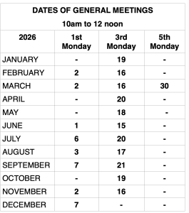 and the last meeting on 1st Monday in December(Excluding Public Holidays) Commencing at 10 am with a cuppa and a chat